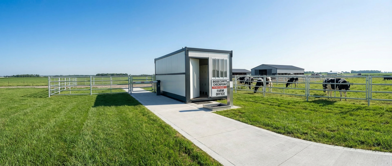 Caseta plegable de 20 pies (≈13m²) diseñada para explotaciones agrícolas y ganaderas, como módulo higiénico de transición entre zonas limpias y sucias.