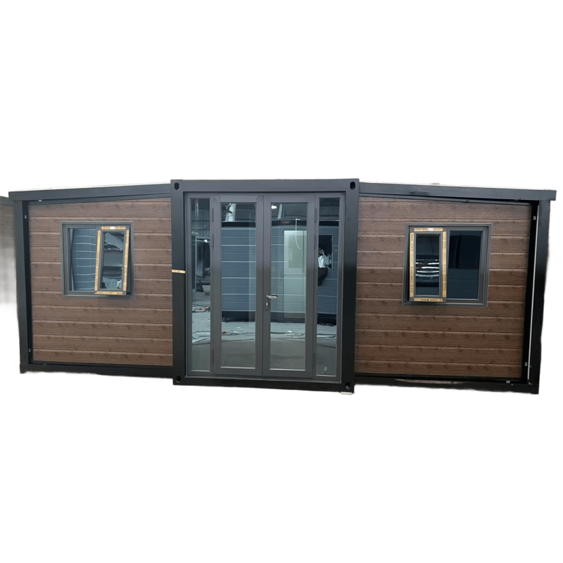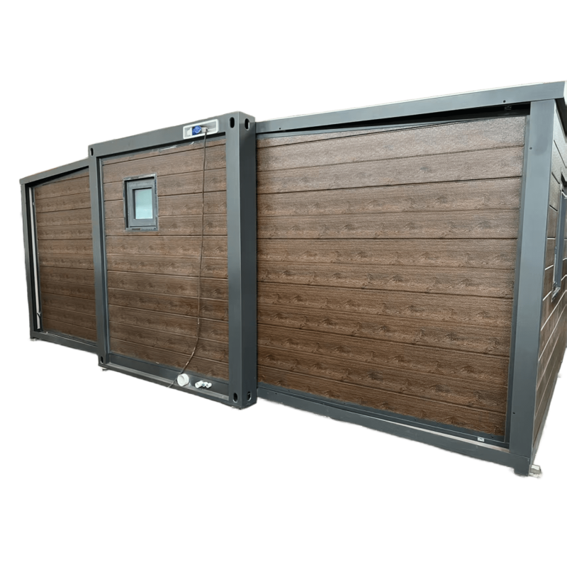 La FoldBox 37 / Nogal es una casa plegable expandible de 37 m² con revestimiento efecto madera oscura y diseño contemporáneo.