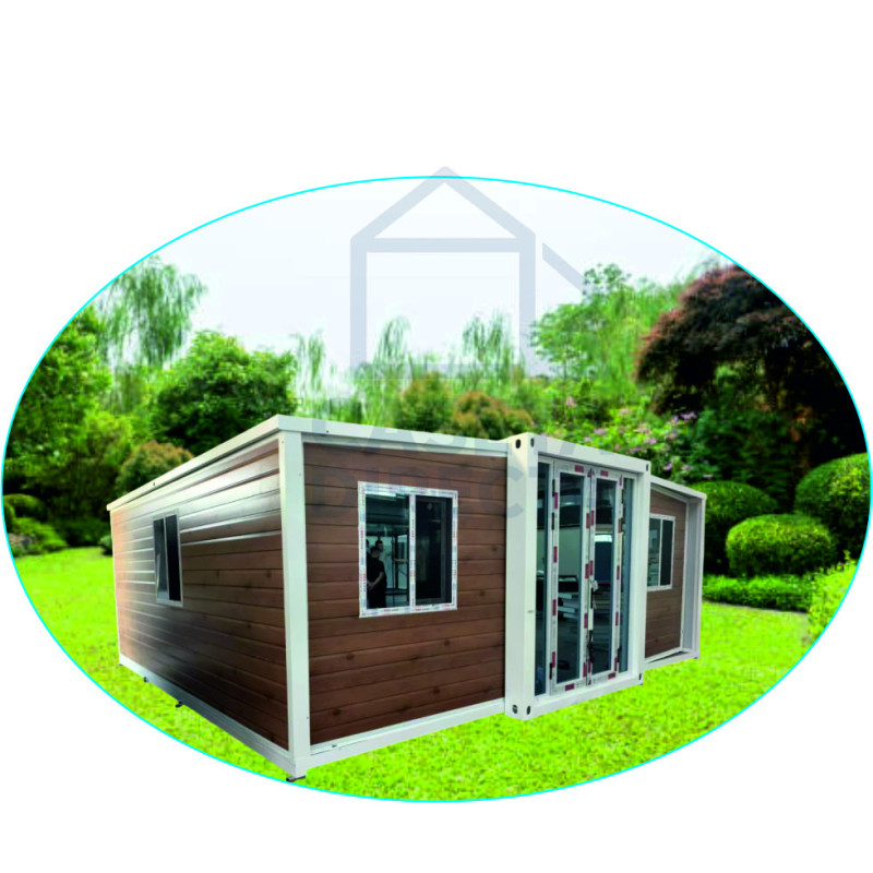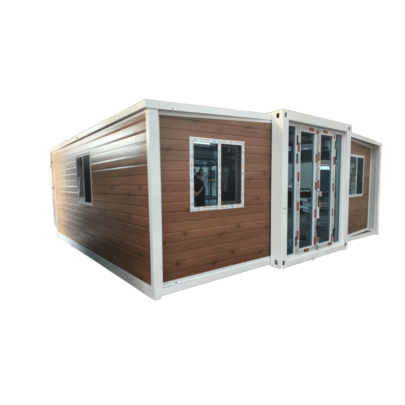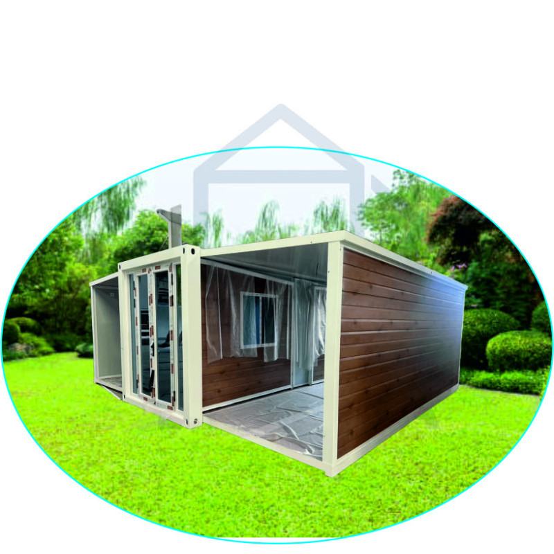 La FoldBox 37 / Cedro es una casa plegable expandible de 37 m² con revestimiento exterior tipo madera Cedro y estilo contemporáneo.