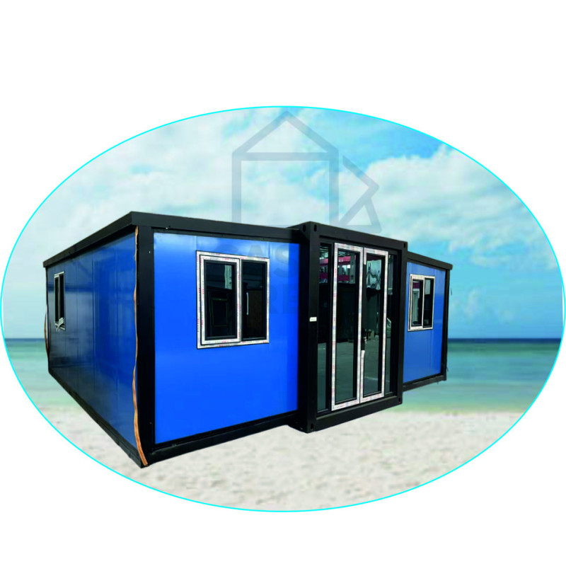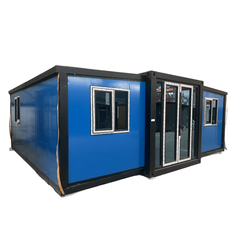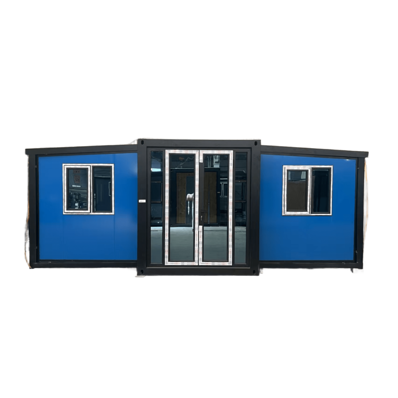La FoldBox 37 / Cobalto es una casa plegable expandible de 37 m² con revestimiento exterior azul eléctrico y diseño contemporáneo.