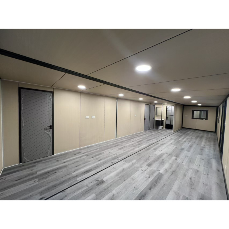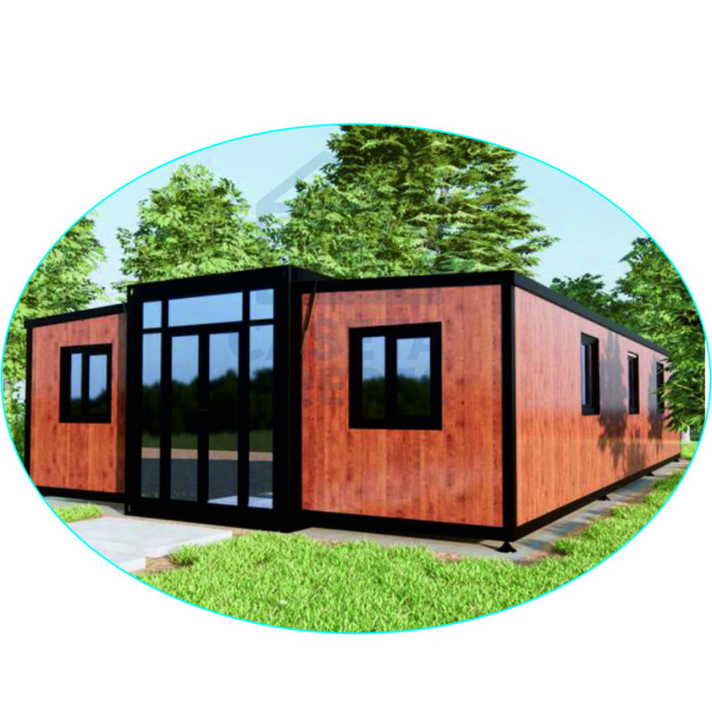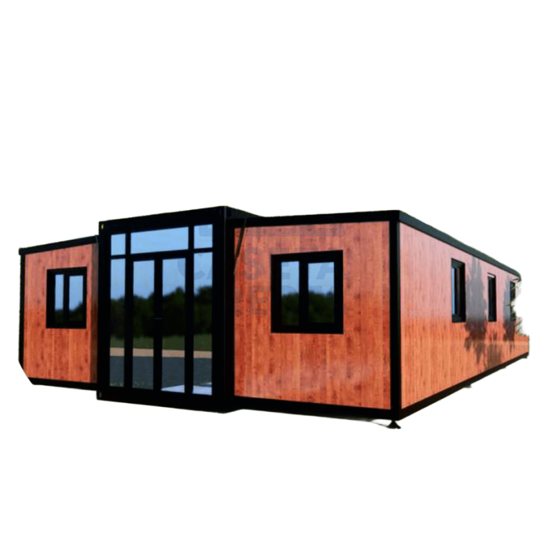 Casa plegable expandible de 75 m² con distribución base de 2 dormitorios, baño completo, cocina equipada y amplio salón-comedor. Puede configurarse con 3 o 4 dormitorios según necesidades.
