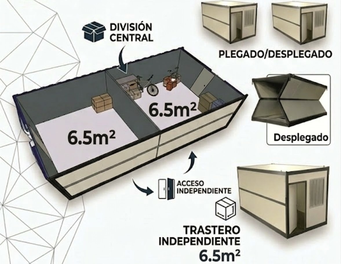 - Panel divisorio central para crear dos trasteros independientes.