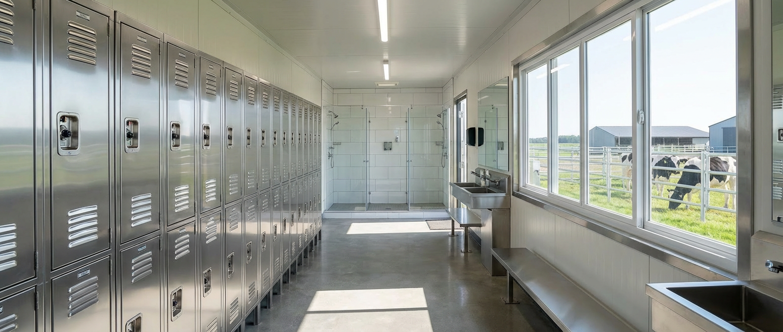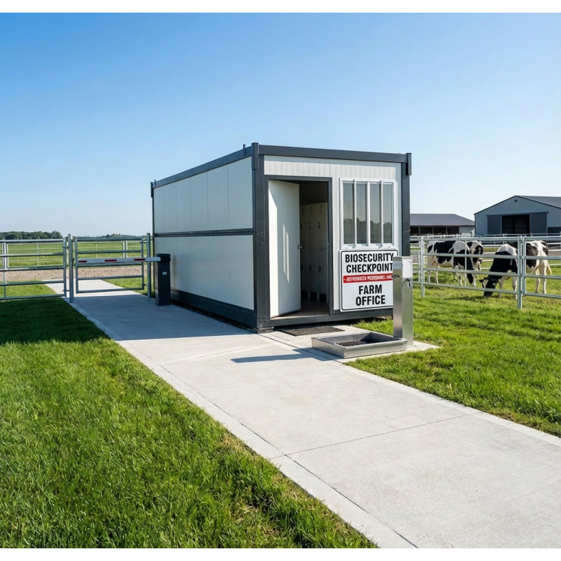 Bioseguridad Total: Diseñada como punto de entrada único. Evita la contaminación cruzada y protege la salud de los animales mediante flujos de paso controlados.